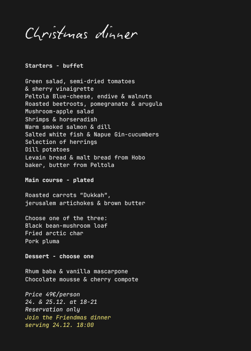 Hobo Helsinki Christmas Dinner 2025 is here to keep the season tasty. Served on December 24th and 25th in our 1st Floor Bar, this festive feast is all about bold flavors, cozy vibes and a little holiday sparkle.